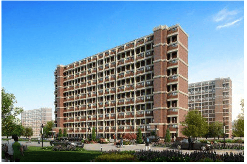 布局:项目总规划用地面积为 59733.66㎡,建筑占地面积 89600㎡,共 1148 户,停车位 870 个,规划西区 7F 复式住宅及东区 12F 平层住宅、2F 联排住宅。