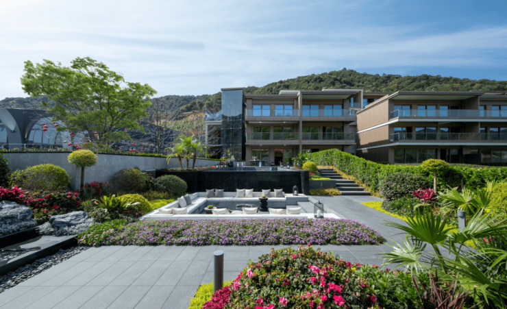 建筑规划:整体建筑立面以现代主义风格为主,建筑形体简洁、大气,以暖色调为主,辅以大面积落地玻璃和干挂石材外立面,让建筑与自然环境完美融合。建筑群依山迎湖自由布局,因地制宜,尊重自然肌理,规避了建筑同质化问题。