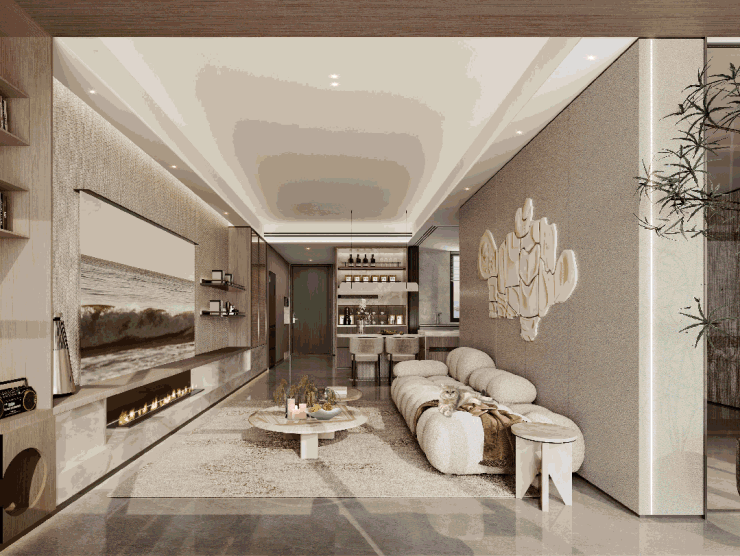 比如门口墙体的凹凸面可打造约5.3㎡(投影面积)的多功能收纳玄关柜,鞋子、雨伞、衣物等统统能收纳;厨房预留了双开门冰箱空间,为家电腾出了更多空间;电视背景收纳柜也留有专属的空间。
