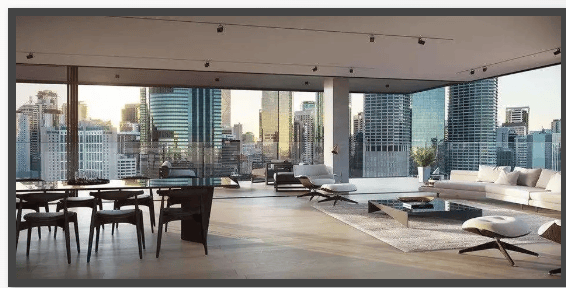 建筑风格:流线型现代风,大面积镜面玻璃 + 金属铝板外立面,景观由美国易顿设计 “七彩凤林” 七重空间,水系与绿地交织