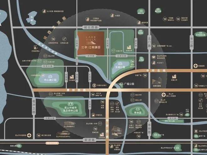 中心湖公园、昆山森林公园、玉湖公园等生态绿境在侧,氧护生活;