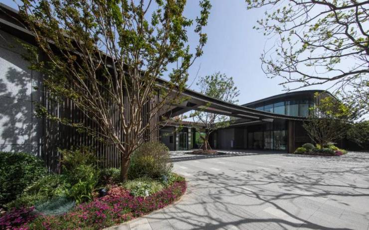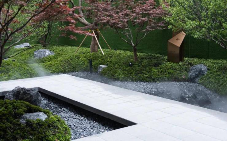 场地空间形态狭长,宽窄均一。项目通过调节绿植、地形、矮墙、色彩、铺装等变量将场地划分为五种富于变化且过渡自然的空间, 在参观流线上给予客户丰富的体验。