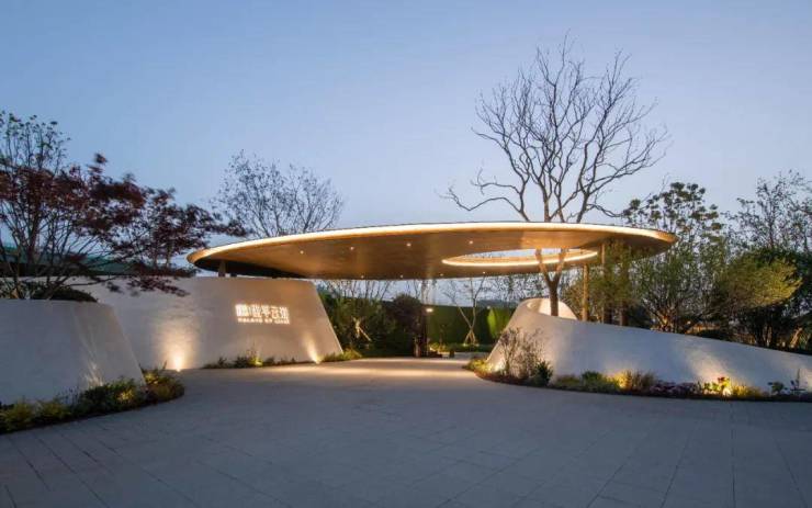 景观门头的设计语言采用新颖的曲线倒圆角的形式,做到了与售楼处风格的完美统一融合。和平云璟是一个便利于各个人生阶段的居民的生长型社区,设计师将“生长”的寓意栽种于归家的礼仪庭院中间。圆弧的树池象征着生命如四季一般轮回接替,家族树象征着家族的繁荣兴盛、开枝散叶。在一侧的墙体间做镂空的处理,可以透过格栅看到对面的郁郁葱葱的雨水花园。