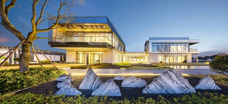 社区规划:分南北两地块,共 97 栋 3–5 层现代极简风格建筑,大面积玻璃幕墙,270° 景观视野,独栋为主,散落式布局保障私密性