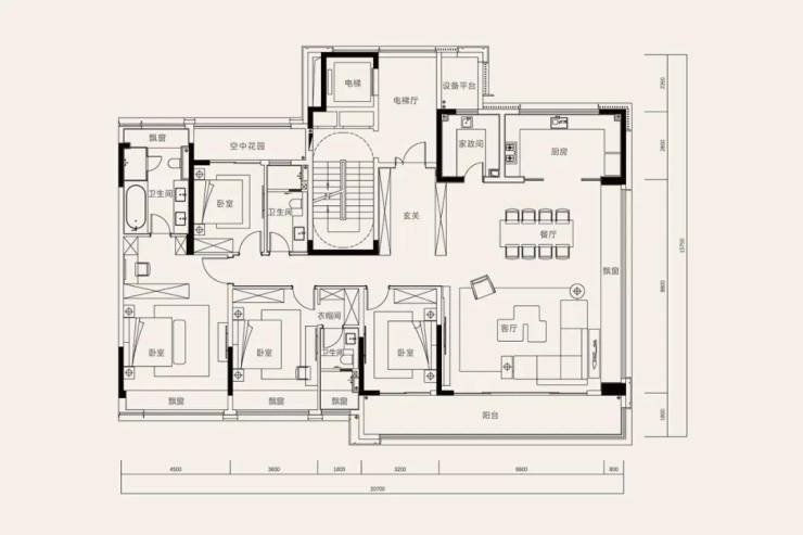 四房两厅三卫设计,客厅升级成了大宽厅,面宽更大,空间感更强,整个宽厅的面积有将近50㎡。