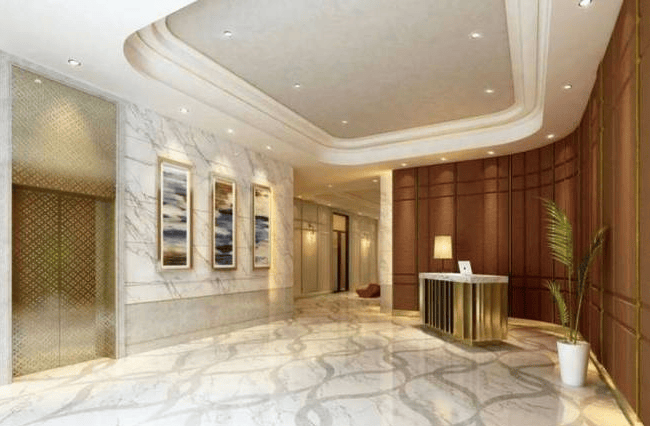 滨江一品苑的7米高入堂大厅。所有户型的厅、堂、卧室均采用落地观景窗,以保证充分采光及大面积景观视野。