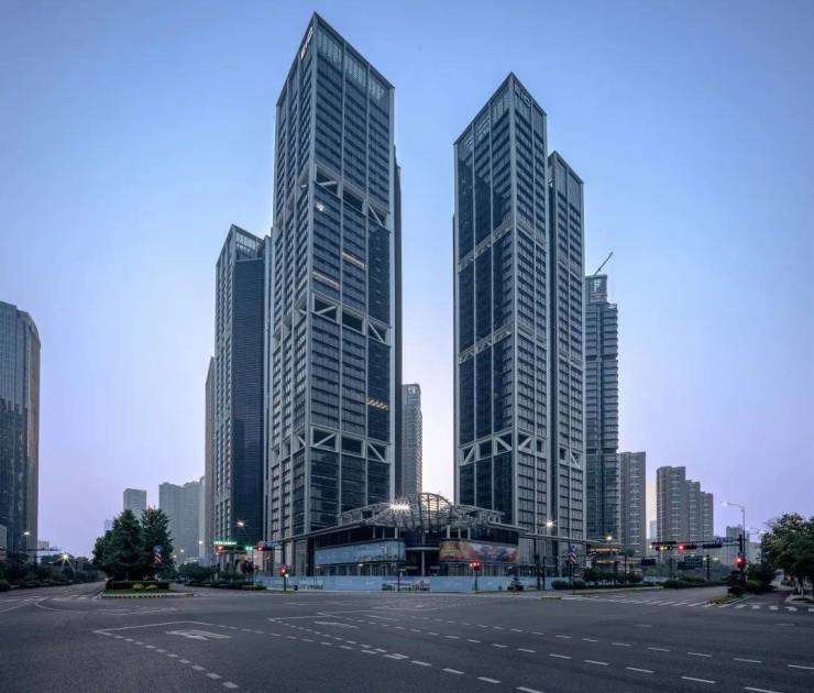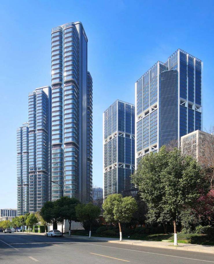 建筑特色:以 200 米高空双子塔为核心建筑,外立面采用四面大面积玻璃幕墙,搭配干挂石材与金属铝板,还有 “梦露裙摆式” 流线雨棚,270 度弧形立面能最大化收纳江景与城市风光。同时采用梯田理念,首层架空层引入垂直绿化,空中花园与屋顶农场形成立体生态网。