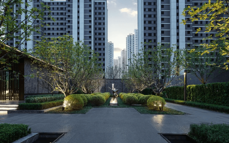 龙湖华盛天曜的园林景观设计遵循了“一环·一轴·两庭·九园”的规划设计体系,同时融入了不少高档社区的细节理念。