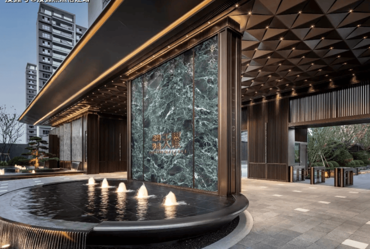无论是门头烫金醒目的案名,还是两侧修剪齐整的罗汉松,亦或是汩汩涌动的水景,都透露着不动声色的矜贵。