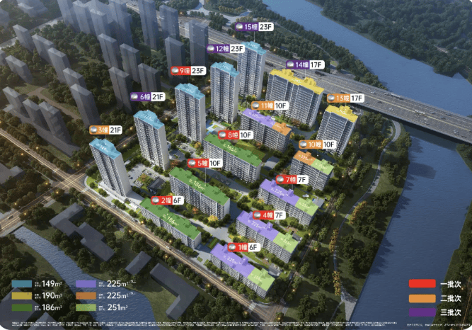 产品类型:涵盖149㎡-250㎡的洋房、小高层及叠墅,容积率2.0,绿化率35%,车位配比1:2.2。