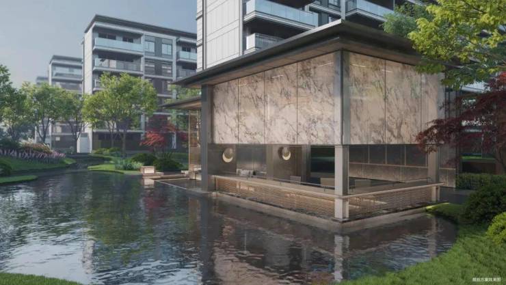 项目伴山面湖,目前约1.5万方水晶湖正在建设中,为了更大程度呈现枕湖观山的生活情境,在园林打造上,取义寄畅园,引水入园,融入叠溪、松云、山石、丘屿、观湖等元素,匠造曲廊幽径、临水高阁。臻选贵木全冠移植入园,高定山前湖畔至臻墅境美学。
