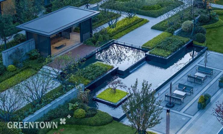 步入园区,以湖海塘为灵感设计的中央水花园,显得格外瞩目。金华沁园“微度假、慢生活”的园林设计基调,便由此而定。