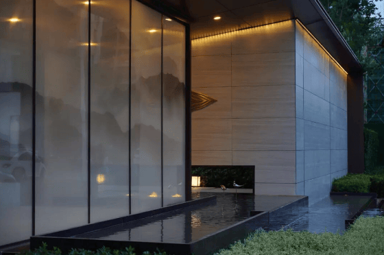 中庭景观用水,石,林,泉,四要素营造出一个宁静温和的中庭空间。穿过门廊,一幅山水庭园展现眼前,让人赏心悦目。漫步于水中步道,空间在变,人的感受也在变,开阔的水面带来了心情的舒畅,远处涓涓流水随风而来,人在空间中的体验是多维的,可观,可听,可游,让人可以沉浸在这山水庭园中。