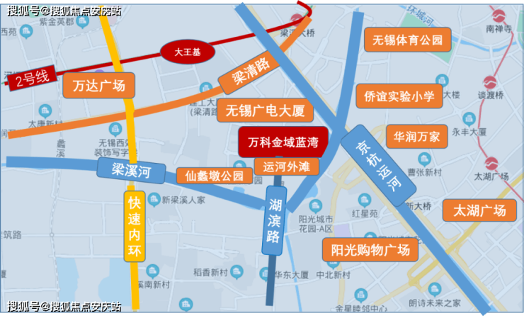 万科金域蓝湾,南北向有湖滨路,东西向有建筑路、梁清路,距离快速内环约1.5公里,穿过开源大桥可前往无锡市中心方向,自驾出行非常便捷。