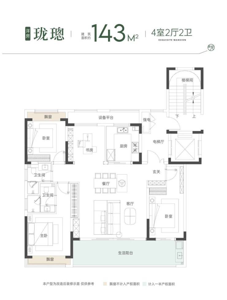 洋房:建筑面积约143㎡ | 4室2厅2卫 ,一梯两户/南北通透/双开间阳台/豪华主卧套