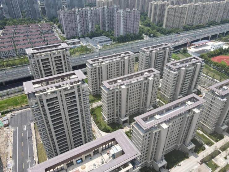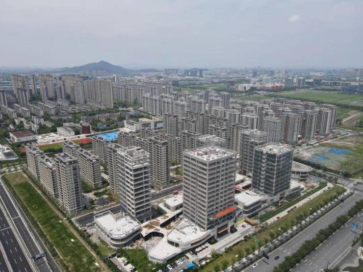 从视频中可以看出,南区住宅部分已进入收尾阶段,外立面的铝板和石材安装完毕、绿化基本完成、房顶博士帽也施工完毕,园区内仍有不少工人在进行作业。