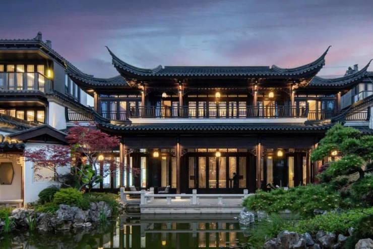 中国传统三进制布局,一进“门”,气势雄伟、威严肃穆;二进“庭”,礼制井然、场面宏大,门口以云龙纹铺地、迎客松、鹤鹿浮雕、重檐屋顶等彰显归家的尊崇礼序和仪式感,三进“园”,前庭后院,古朴韵味,彷如行走在江南水墨画中,移步异景,美不胜收。