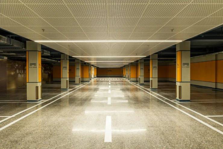 比如他的地库地坪,摒弃了常见的环氧地坪漆,而是选用成本极为高昂的彩色水磨石。