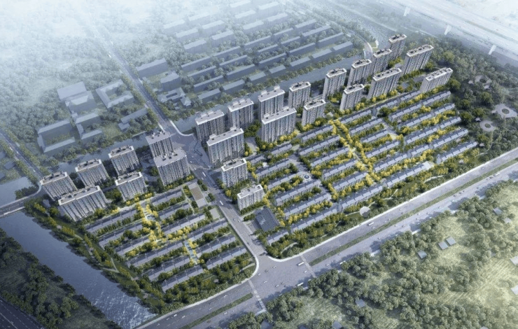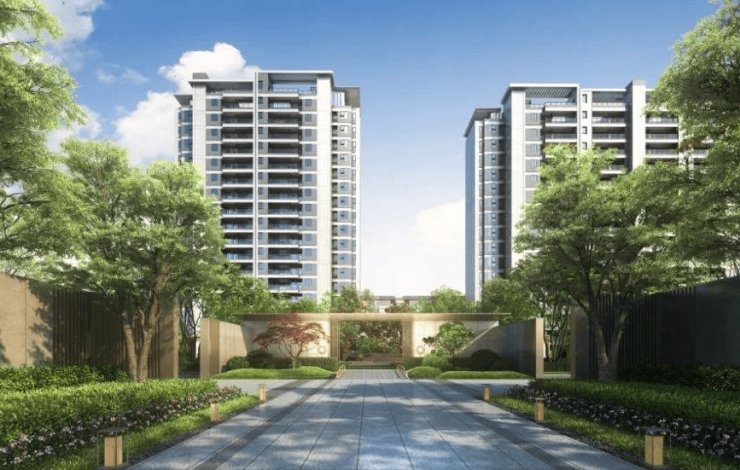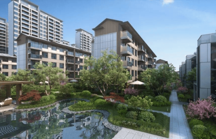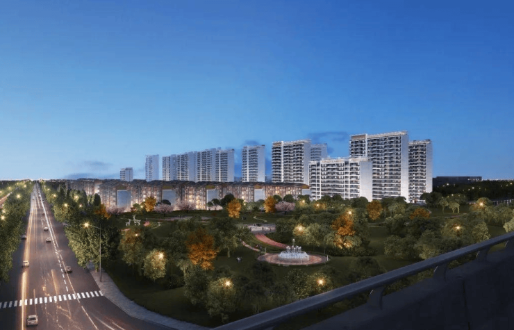 整体容积率约2.0,社区整体为现代风格建筑,打造“一街两轴两环四庭六园十一巷”的景观布局。