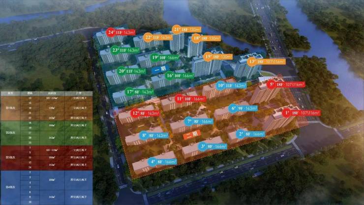 主力户型为建面约 107-166㎡的 3/4 居室,有 107㎡、116㎡、143㎡的 3 室 2 厅 2 卫户型,以及 166㎡的 4 室 2 厅 2 卫户型。