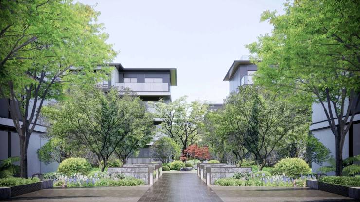 外立面:新中式 + 现代简约,石材 + 铝板 + 大面积玻璃,湖景视野最大化