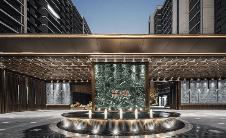 无论是门头烫金醒目的案名,还是两侧修剪齐整的罗汉松,亦或是汩汩涌动的水景,都透露着不动声色的矜贵。