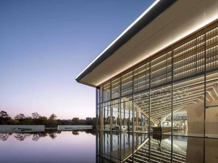 建筑两面临水,因此通透的玻璃幕墙延展了空间,内外光相互渗透。大面积的线型光充沛室内,营造空间序列。设计师利用空间中光影强度的变化,使空间产生差异化,当人们在外围透过玻璃幕墙望去时,便可以感受到光旋律变化所带来的富有变化的空间序列层次。