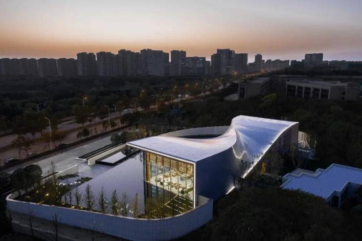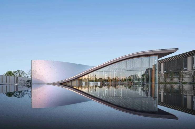 建筑设计理念来源于中国道家的“太极”,整体以最极致的方形扭转后,自然的曲线柔化了建筑原本界限分明的阴阳面,形成屋顶和墙面的自然延续。银灰色幻彩铝板的在日光下,使得建筑表皮的部分物质属性消失了,凸显出充满张力的曲线线条,镜面水的引入更激起了无尽想象的空间,整个过程自然光线的变化无比生动。