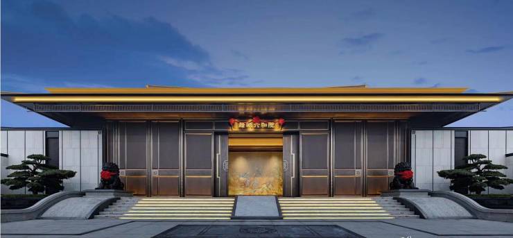 小区的大门设计庄重而典雅,门庭宽约 42m,高约 7m,采用三间一启门,尽显名门望族规制 。门楼主体设计延续宋式民居的线条感,保留了宋式建筑的素雅意境 。大门前约千斤重的铜狮与抱鼓石,寓意平安吉祥,家族昌盛 。两侧价值约 30 万每棵的迎客松,欢迎着四方贵客 。脚下的汉白御道,让业主在归家途中感受到尊崇与荣耀 。门楼的景墙上呈现的《千里江山图》,云山秀水,气势恢宏,颇有引人入画、梦回大宋的意境 。