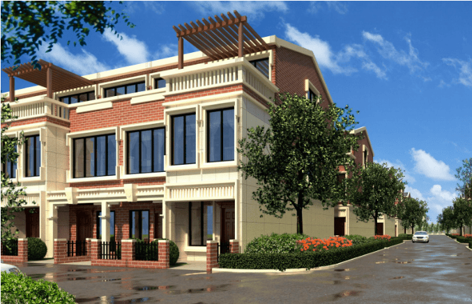 联排别墅,精装修,地上三层,带花园、带露台。建筑风格
