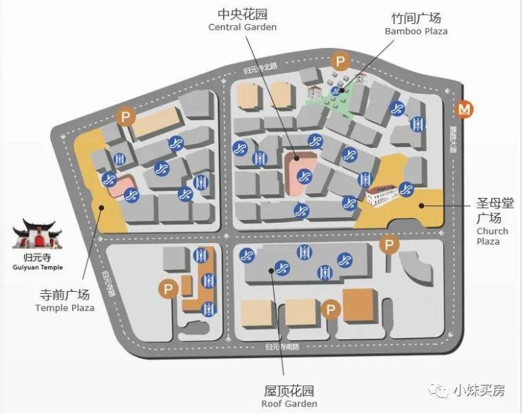 远洋里规划了五大公共城市空间——寺前广场、圣母堂广场、竹间广场、中央花园、屋顶花园,两条横纵景观大道——西大街、翠微路,及七所庭院,以“点、线、面”的形式,共同构成了“移步换景”的大氛围。