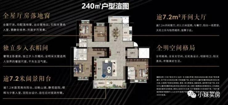 建面约240㎡的户型:这款户型是标准的大平层产品,电梯单独入户,设计有电梯前厅和入户玄关,保证入户的私密性、安全性及空间感。一进门,餐客厅连为一体,从餐厅到客厅再到阳台,一个连贯的动线设计,7.2m的大横厅设计,让整体空间更加大气尊贵。