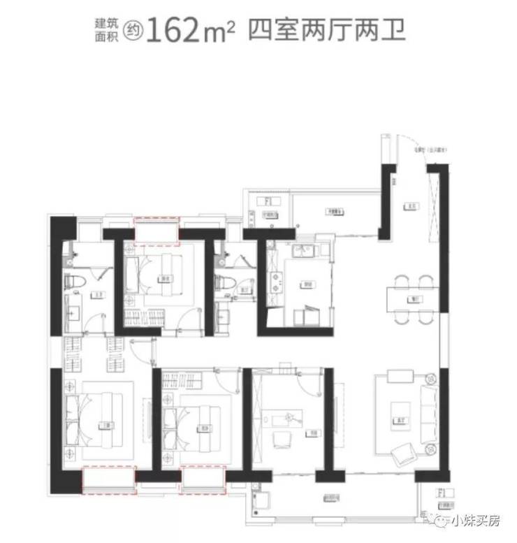 小妹看完所有户型后,觉得两款大户型产品很惊艳,先来看看建面约162㎡的户型。常规的边户一般多是南向面宽小,进深比较长,大多数都是两开间朝南;而远洋东方境的边户产品非常棒,都是南向大面宽,且短进深的优质户型,加上边户还是三面采光,所以说边户的采光效果那是极佳的。