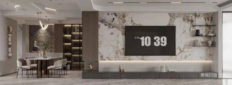 餐厅与客厅一脉贯通,以水吧台与餐桌将空间自然分割,使得舒适度与开阔感最大化,餐厨分而不离,无论家庭聚会亦或一家人的一日三餐,在这里交汇出别致的韵味。