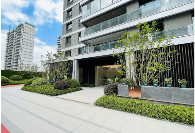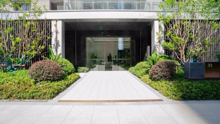 山河万物首层大堂还用电动玻璃移门,取代了传统单元门厅厚重的入户门。
