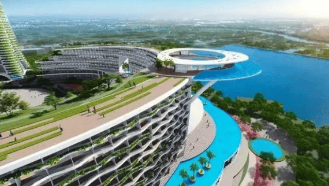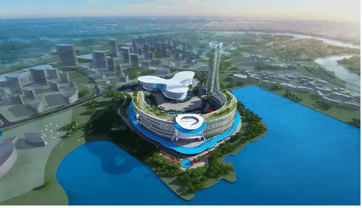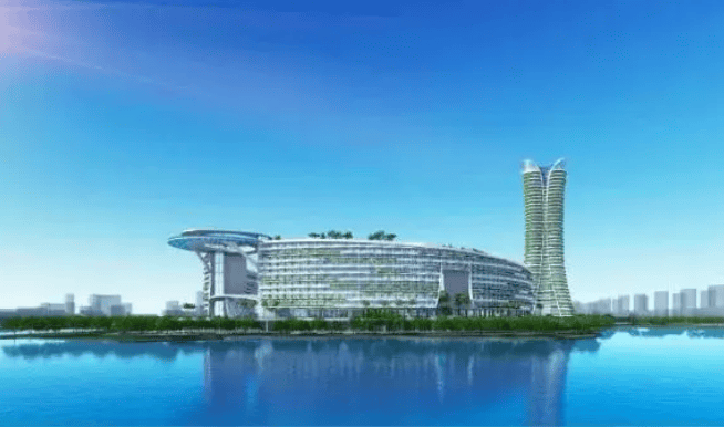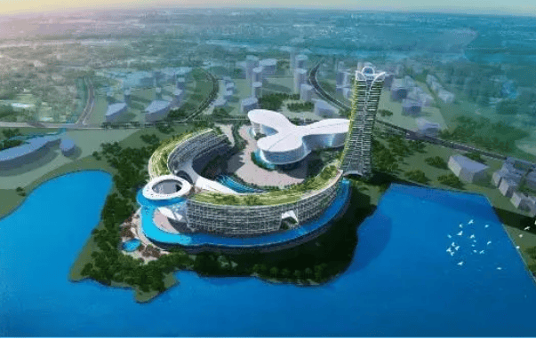 项目分二期开发:一期打造特色水乡小镇和以国际会议综合体“环球中心”为主的生态健康智慧新城;二期打造温泉小镇及酒店核心区。