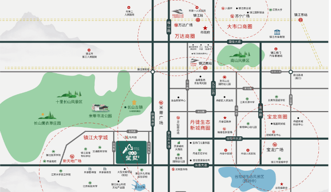 坐拥17000亩十里长山、10平方公里米芾书法公园,300余亩牡丹园,项目西边为5000亩有机生态农庄,3500亩的镇江大学城,零距离感受大自然的宁谧,区位优势得天独厚。