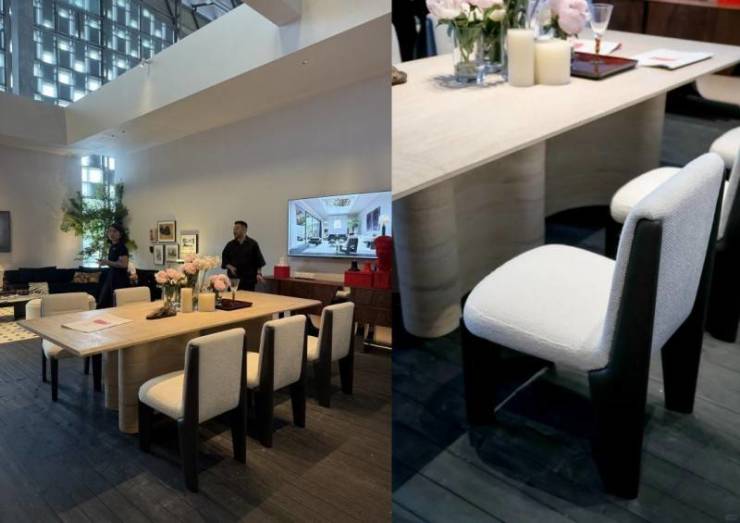 步入展会现场的餐厅区域,舒适、放松的气息扑面而来,处处体现出东方的自然纯朴意蕴。宽大的木纹餐桌表面光滑平整,毫无拼接缝的痕迹,宛如一件浑然天成的艺术品。边缘处精心做了倾斜的细节设计,让用餐者的手肘可以自然地安放在餐桌上,避免了被硌到的不适感。而配合企一照明精心打造的餐厅无主灯设计,光线如一层轻柔的薄纱,均匀地洒在整个餐桌上。用餐者在这样的光线下用餐,拥有良好的照明范围,还能感受到一种亲切愉悦的照明体验,为整个用餐过程增添了一份温馨与惬意。这精妙的餐厅无主灯设计,正是企一照明将健康艺术照明理念融入生活场景的生动体现。
