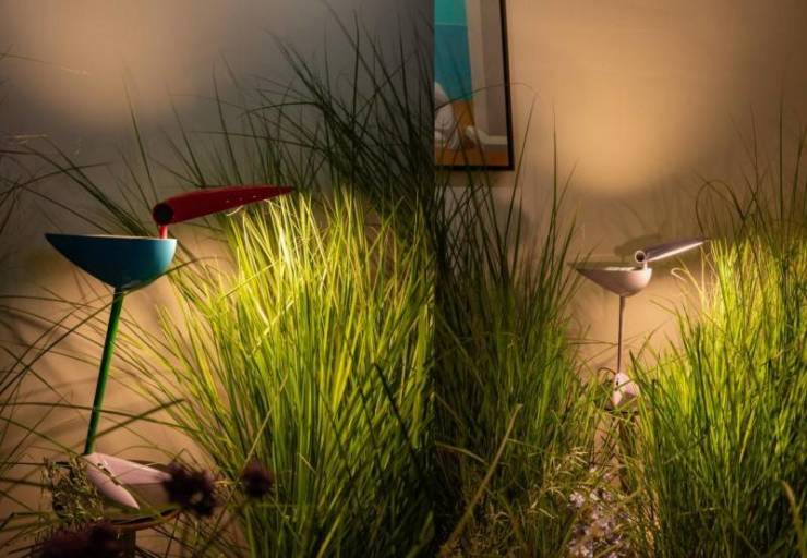 企一照明在展会上展示了创新灯具产品,以实际行动诠释健康艺术照明理念。展会现场掩映在芳草花园场景中的“小鸟灯”成为一大亮点。设计初衷是打造一款人们愿意长久使用的灯,既好看又好用。造型上,以一只比例精确的小鸟为灵感,经过精确几何设计,运用永恒的黄金比例,带来永恒的设计秩序,同时头部、身体关节可灵活扭动,方便实用。