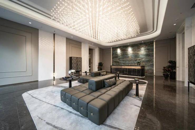 进入鼎阔大堂,仿佛置身于安达仕酒店星级酒店,取景框的设计形式,步入其中仿佛入画一般。同时,四组门采用工艺罕见的从上到下的通体木饰面、珍珠鱼皮的墙壁纹饰、纯手工漆面饰顶……奢贵气质扑面而来,给人尊贵包裹感,“繁而不杂”的生活美学,华贵纯粹。