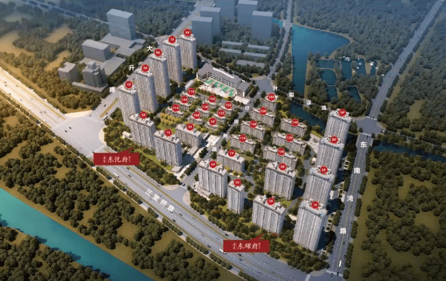 东耀府:总建筑面积 145535.9 平方米,有 16 栋单体,其中高层 8 栋、洋房 7 栋、小高层 1 栋,最高单体 27 层。采用新中式建筑风格,精选高质石材,搭配三玻两腔玻璃等。