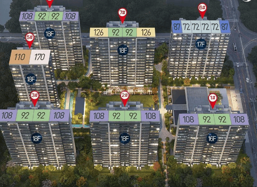 规划楼栋及总户数:7 幢高层(16-18F)共 484 户,1 幢配套用房。
