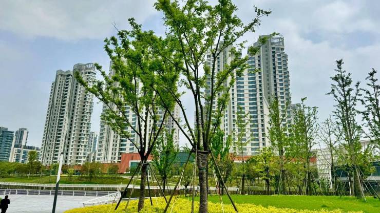 景观设计:借势坡地公园和滨江绿地高差,创造三层阶梯式的大面积集中绿化,视觉上立体有层次,还营造了独特的 “庭院式入户” 归家体验。