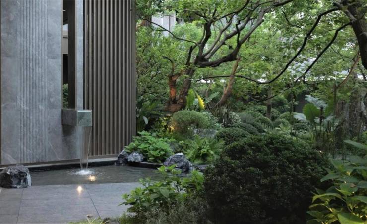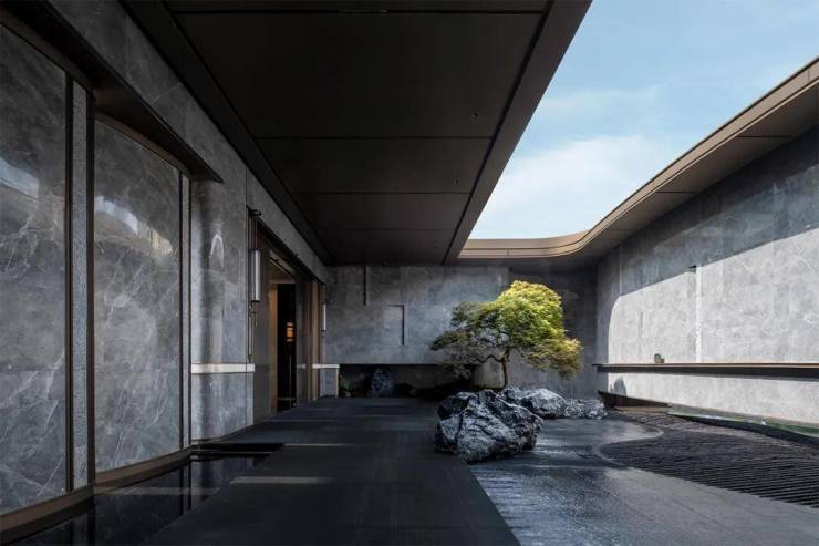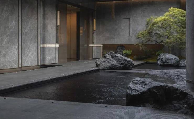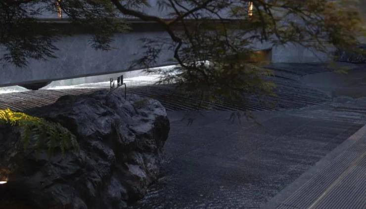 归家水景以中国黑石材竖向拉槽工艺营造千里江山图的起伏节奏,演绎入海观潮的水景效果。水院对景精选有百年树龄的羽毛枫作为点景树,与沉稳的黑石、灵动细致的流水融为一体,为空间增添了庄重与雅致的人文气韵,赋予整个水院一种宁静而高贵的氛围。