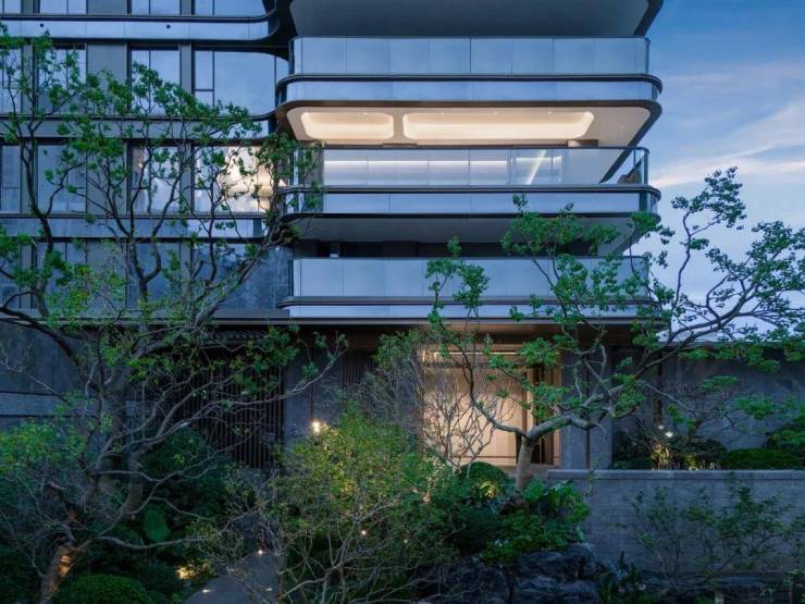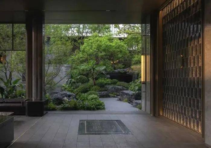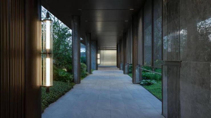 后场空间为三进隐奢庭院,以构筑、景墙形成框景,游园如观画。苍翠树林、自然置石与氧气会客厅围合而成的归家花园,带来极致的隐奢感。