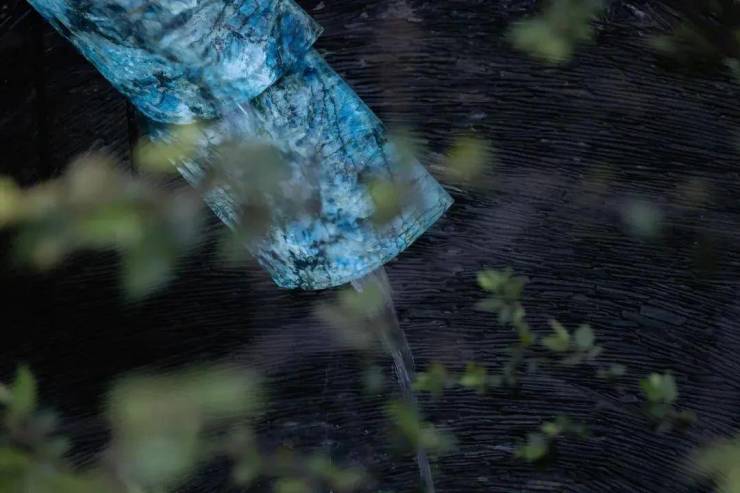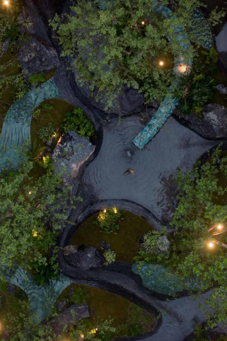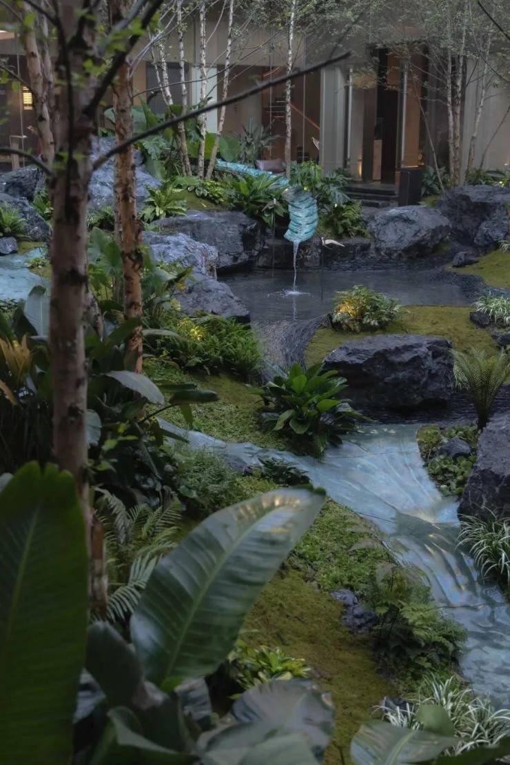 设计对新材料、新工艺进行了大胆的使用,池底由工匠用页岩一片片打造出冲刷的肌理。同时,精心挑选了孔雀绿液态大理石,细致打磨出自然的流线型态,隐入层层植物之中,与溪流虚实交织,连同潮湿的青苔绿植、黑山石一起,叙述着下沉庭院的自然隐奢质感。