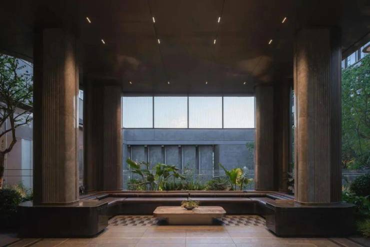 依偎在建筑和绿植中的下沉庭院,提取了江流的流线形态,用现代手法模拟山水之形,实现自然渗透的立体庭院景观。