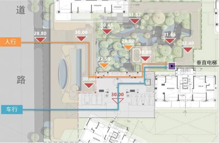 驾车归家:业主可以直接驶入地下车库,再进入社区大堂。随后,右侧的垂直电梯将业主带至大区台地。