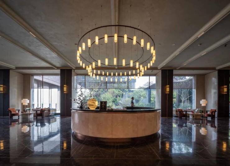 人行入口拾级而上,照壁后别有洞天。静谧水院,以千里江山图的起伏节奏演绎入海观潮的水景效果,廊苑间复现江湖水韵。奢石屏风,缝隙间下沉庭院若隐若现。