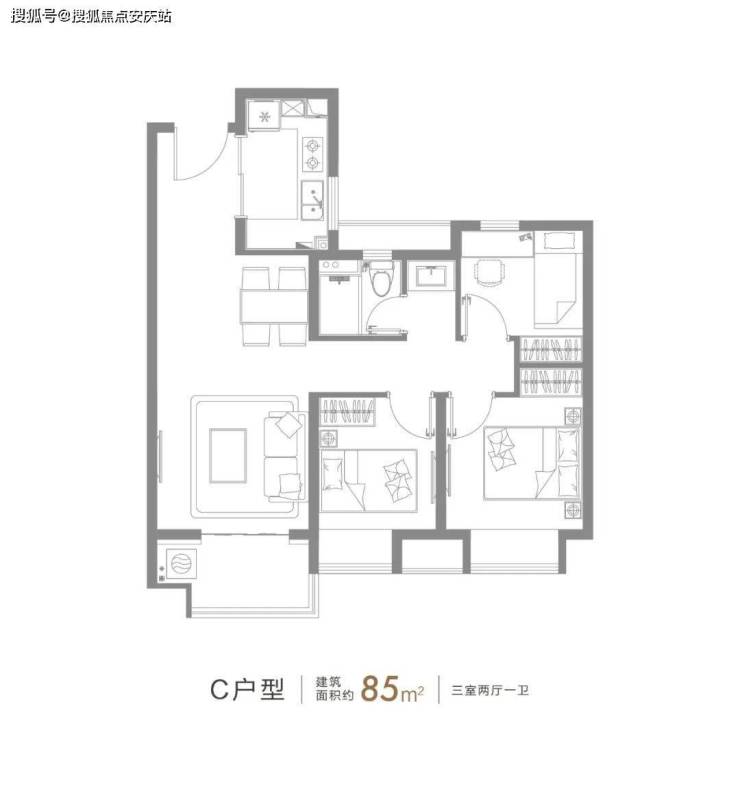 建面约85㎡的3房2厅1卫,三开间朝南+整体动静分离的设计,都保证了这个户型的居住舒适度。